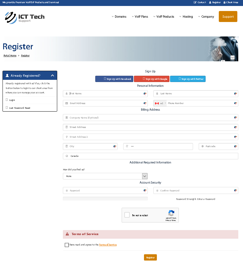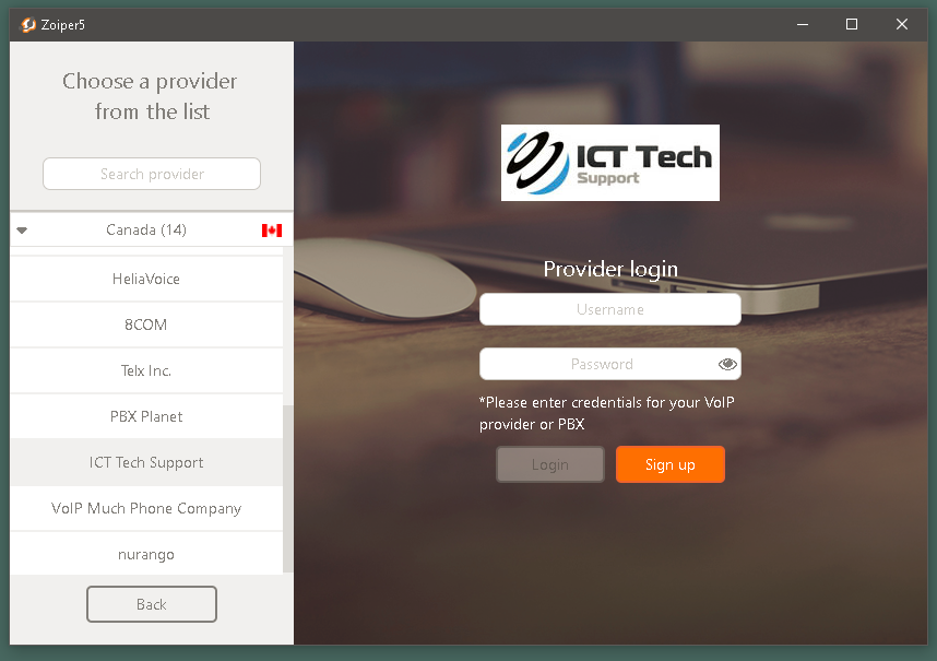 Enter your ICT VoIP account credentials. After signing up you would have received an email about your order with the account registration information.