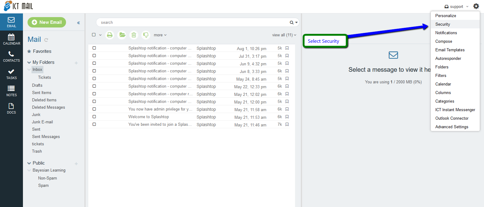 To setup your alternate email address for recovery login to your account and click on the Cog Gear at the top right of the screen. Click "Security".