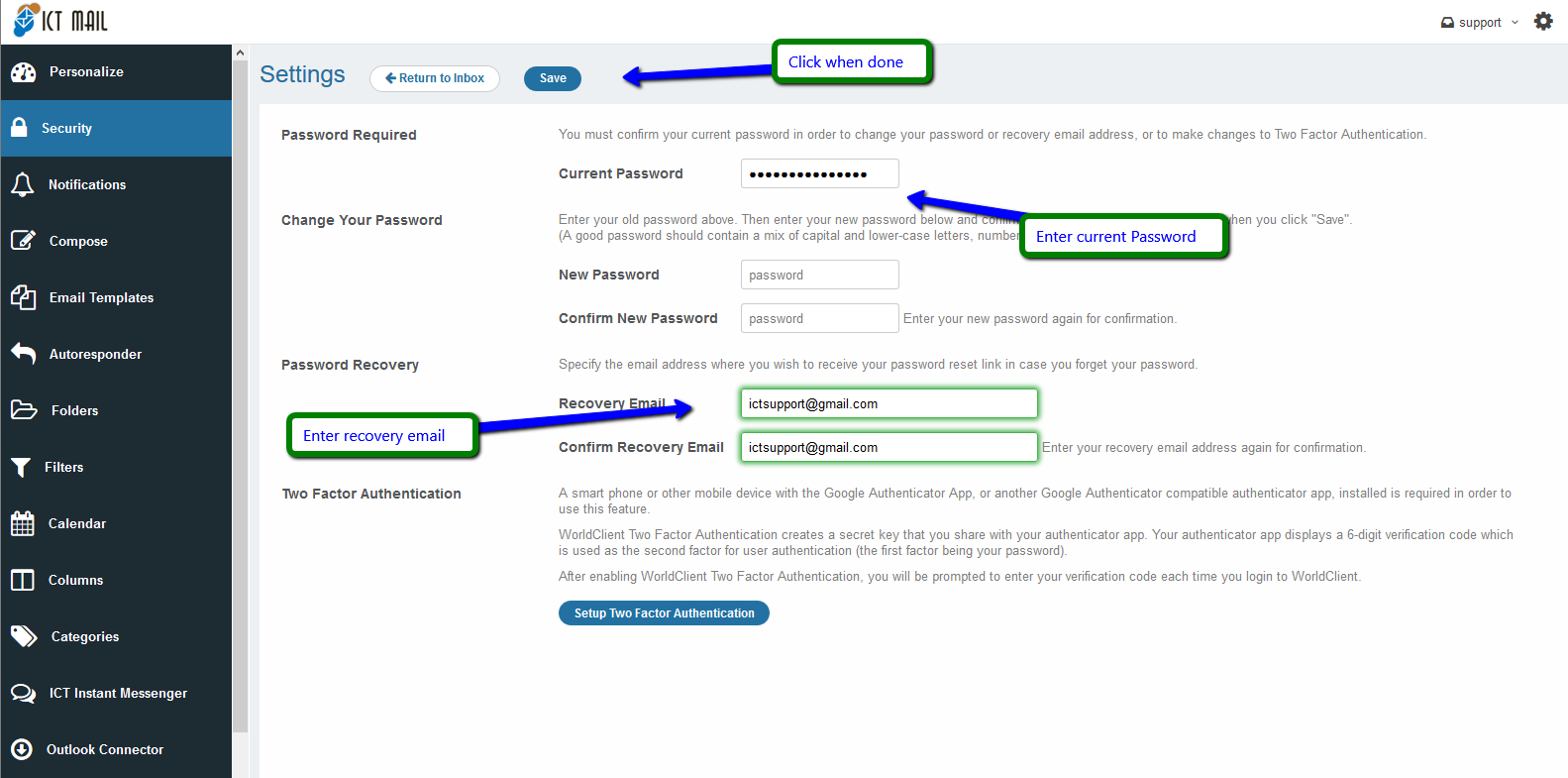 Enter your current password and enter your recovery email. Click Save. You now have a method for using our password recovery system.