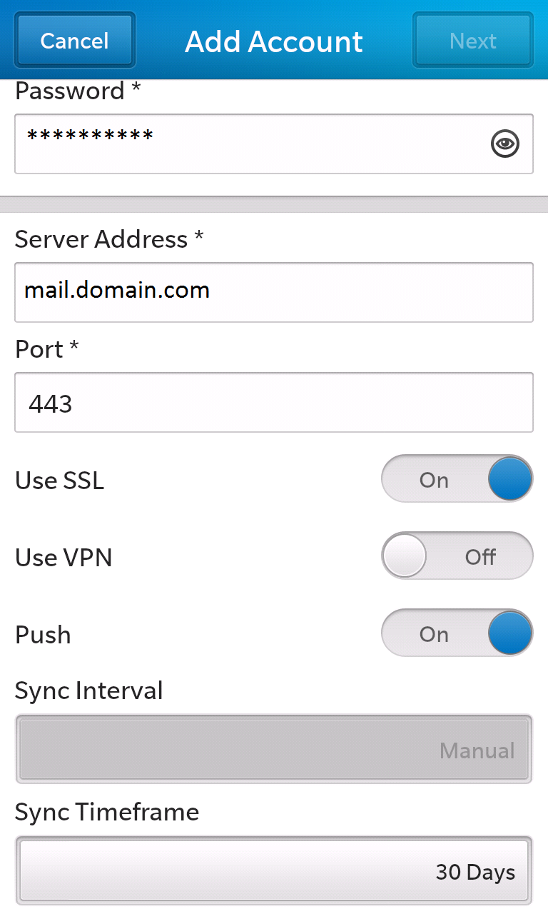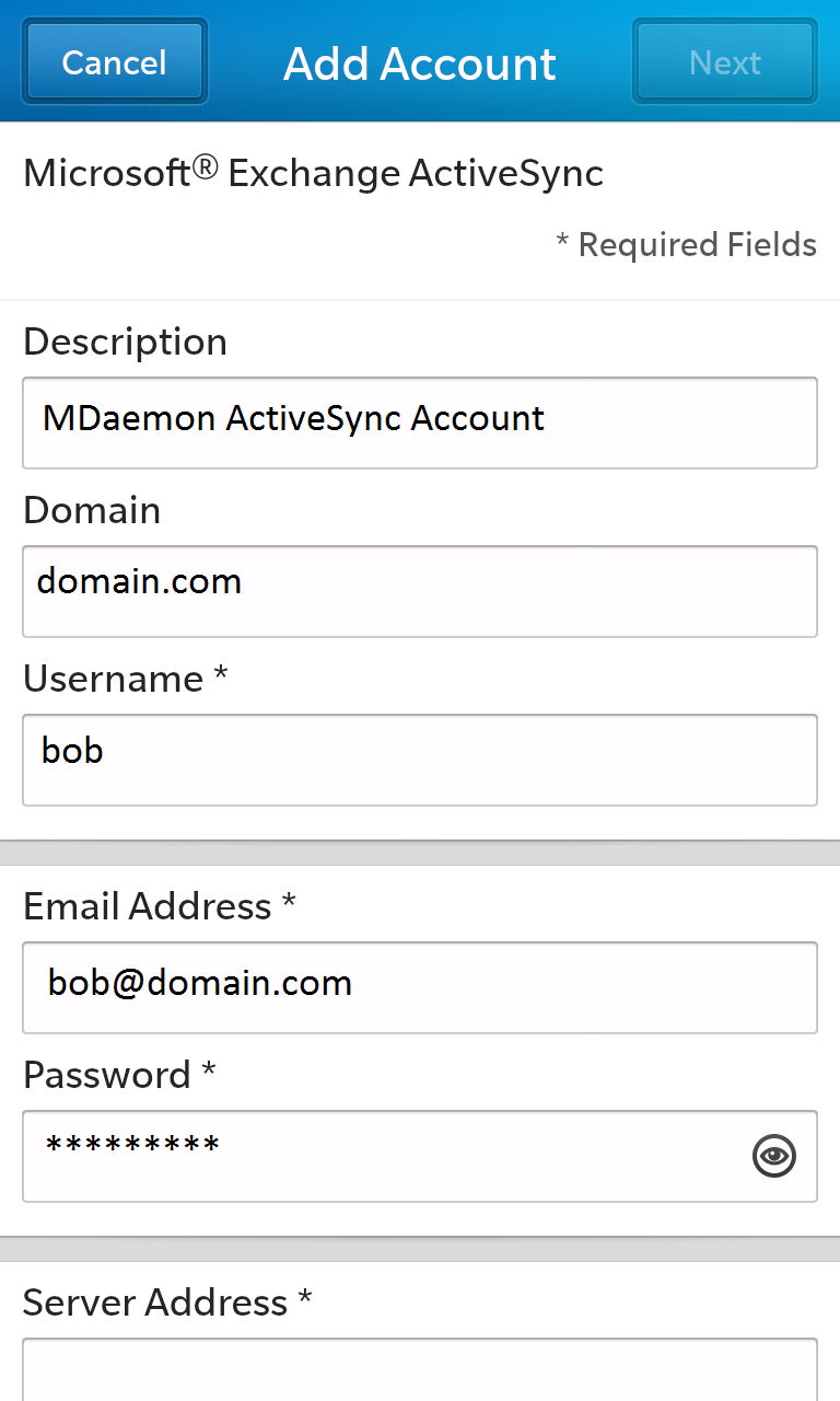 Note: It's important that your 'Username' value is only the bit before the @ sign in your email address as the BlackBerry will construct the logon name it sends to MDaemon using both the 'Username' and 'Domain' values you provide.