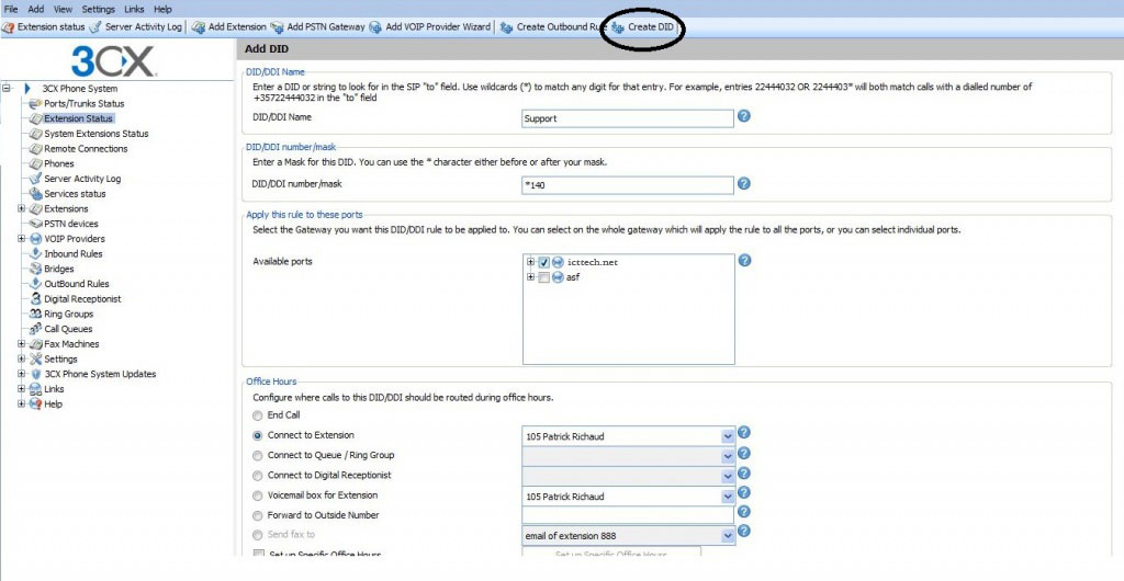 - Click on the "Create DID‟ button in the 3CX Management Console in the toolbar.