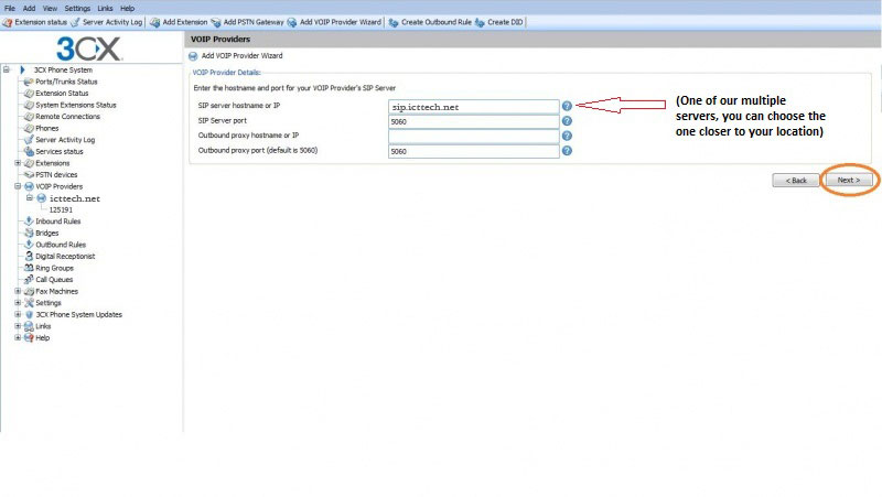 In the 3CX Phone System Portal, in the middle of the upper-part of the screen, we can see the Add Voip Provider Wizard , please click on the link. Once we are there we can put the Name of the Provider, in this case we are going to enter icttech.net and in the Provider list we can select Generic Voip Provider.