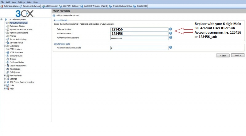 - External Number: 100000 (Replace with your Sub Account username, i.e. 123456_sub)