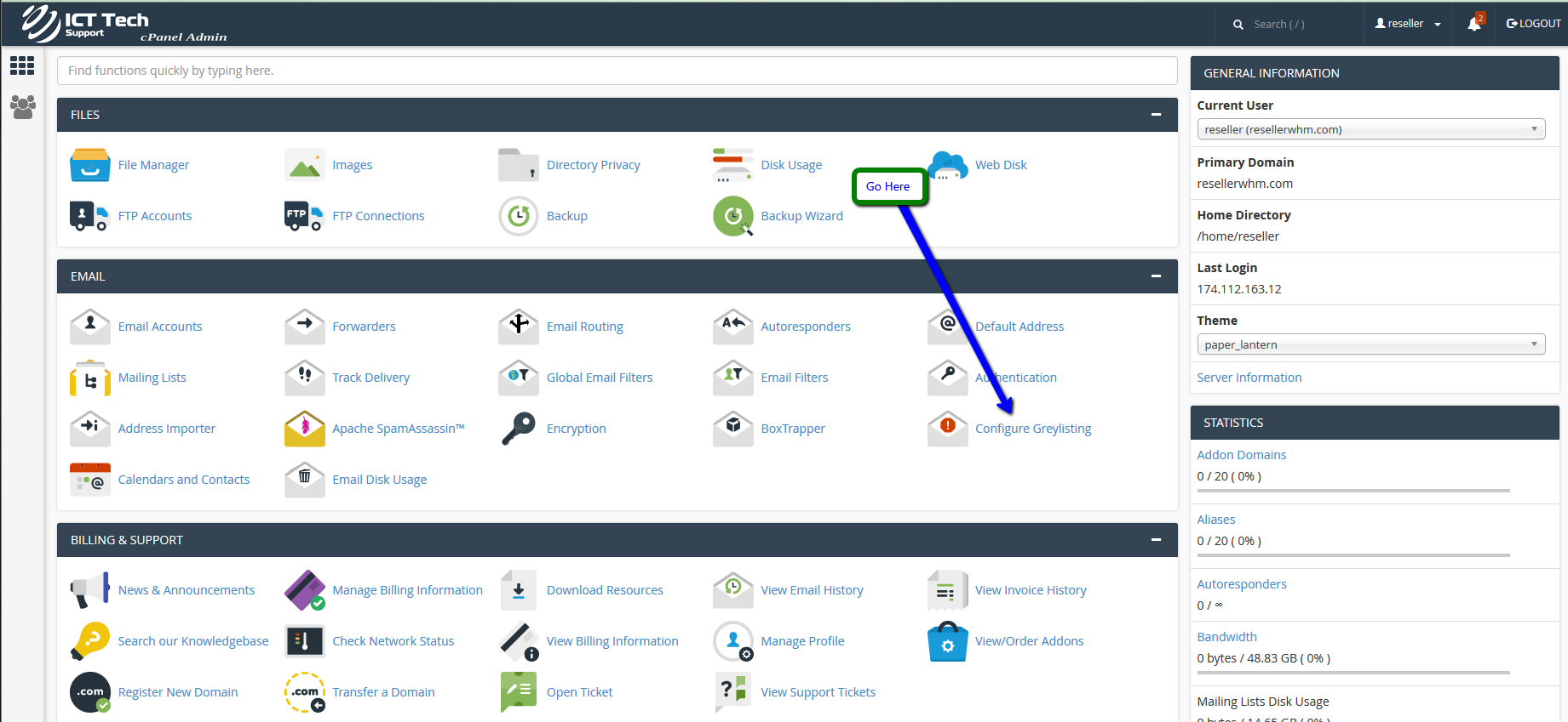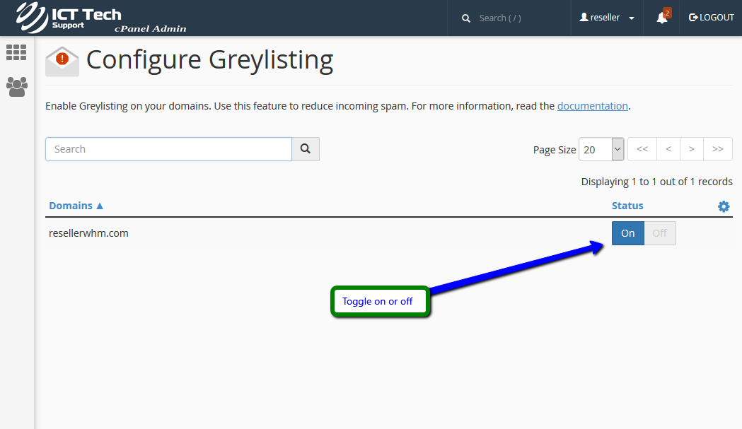 This demo assumes you've already logged in to cPanel, and are starting on the home screen.Then click on Configure GreylistingTurn on or off by clicking the toggle switch icon.