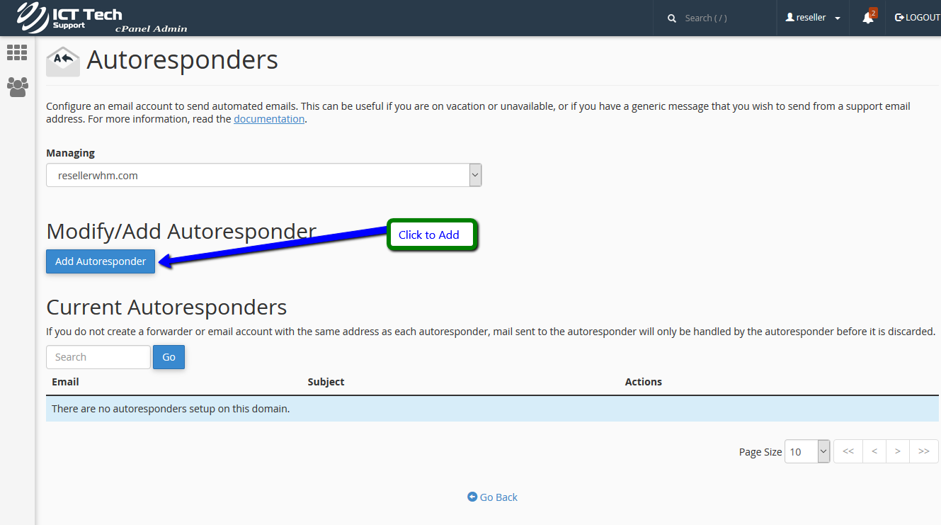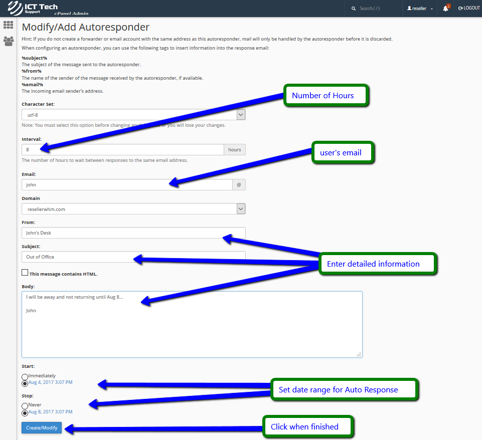This is where you create autoresponders for your email addresses. Autoresponders send messages back automatically, to anyone who sends an email to a specified address. Enter an interval value, then enter an email address you want to set an autoresponder for. An interval of 8 hours means the autoresponder cannot send more than 1 email to an address within an 8 hour period. Now complete the rest of the autoresponder email.
