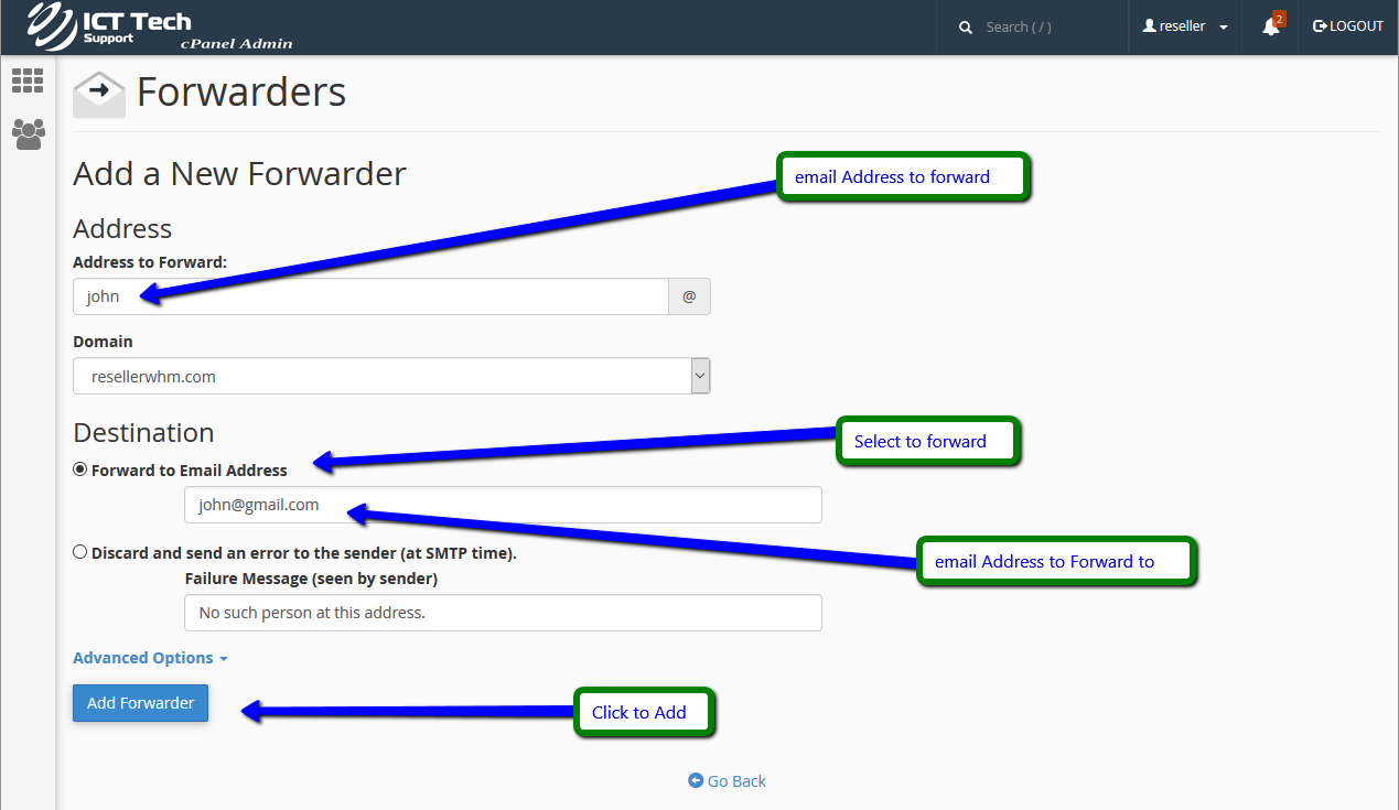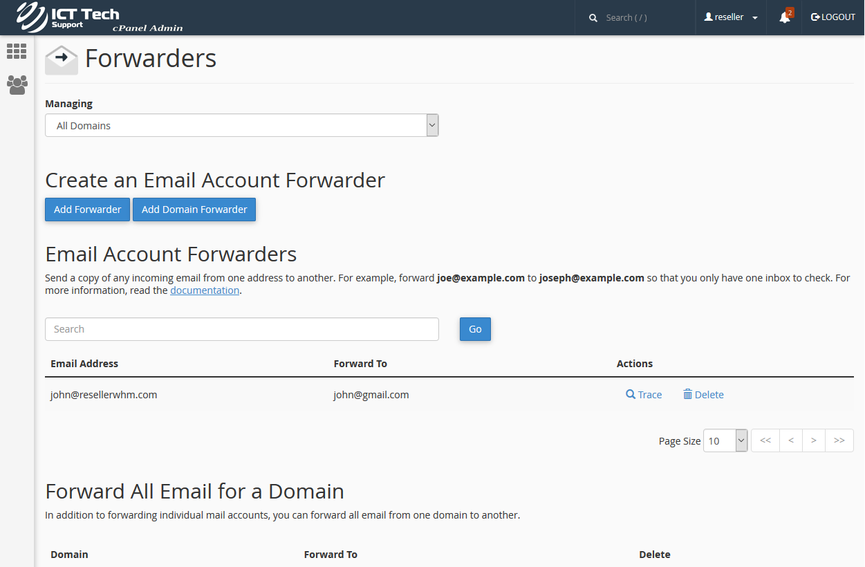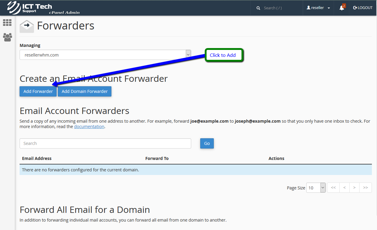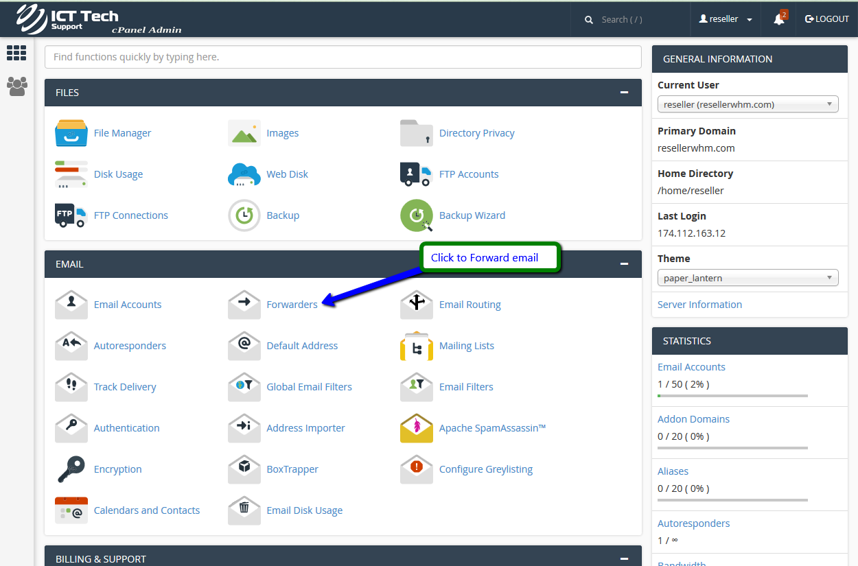 This demo assumes you've already logged in to cPanel, and are starting on the home screen. An email forwarder allows you to send a copy of all email from one address to another. This is handy when you have multiple addresses, but only want to have to check one of them.