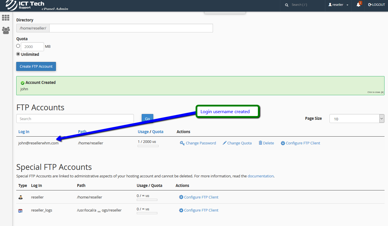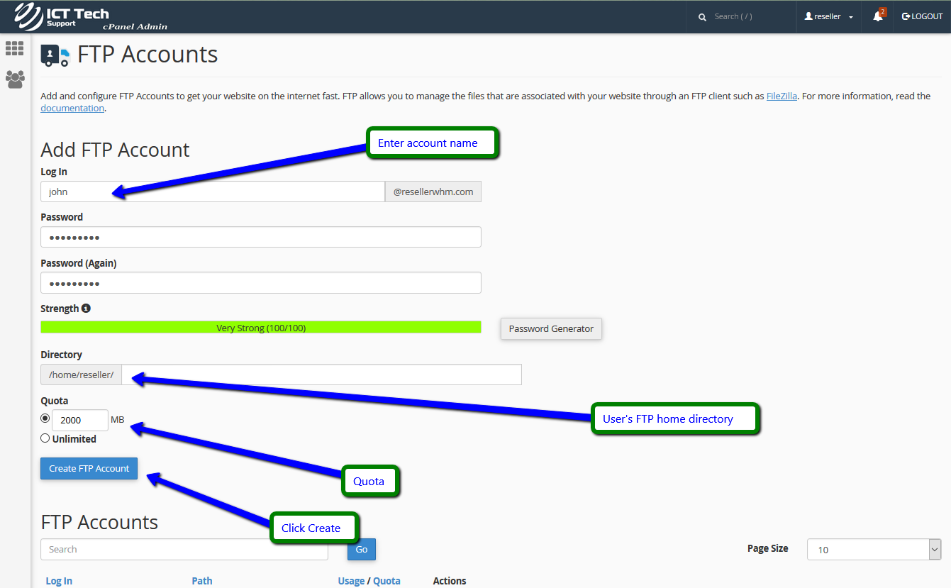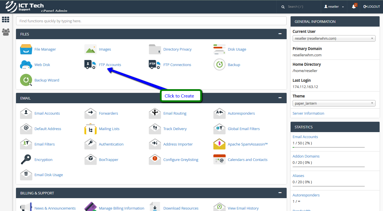 This demo assumes you've already logged in to cPanel, and are starting on the home screen. Click the "FTP Accounts" icon.To create a new FTP account, enter a new login and password.Then click "Create FTP Account".