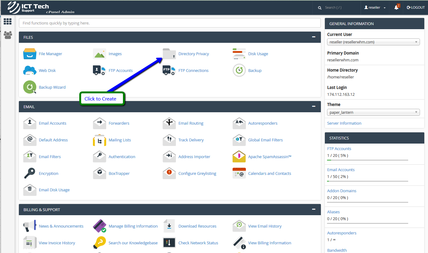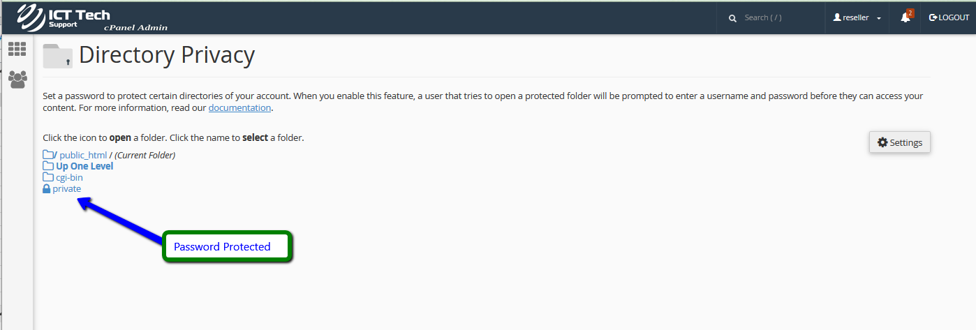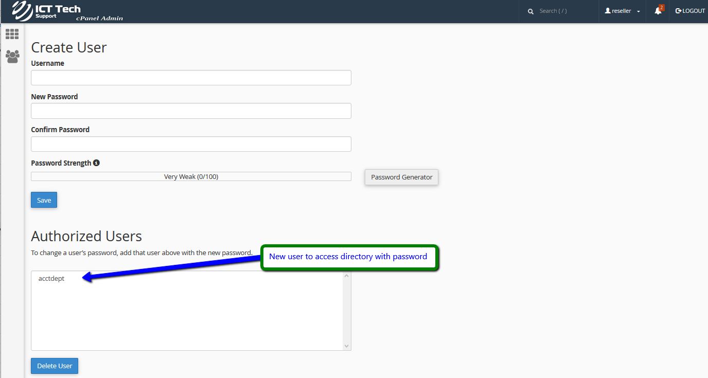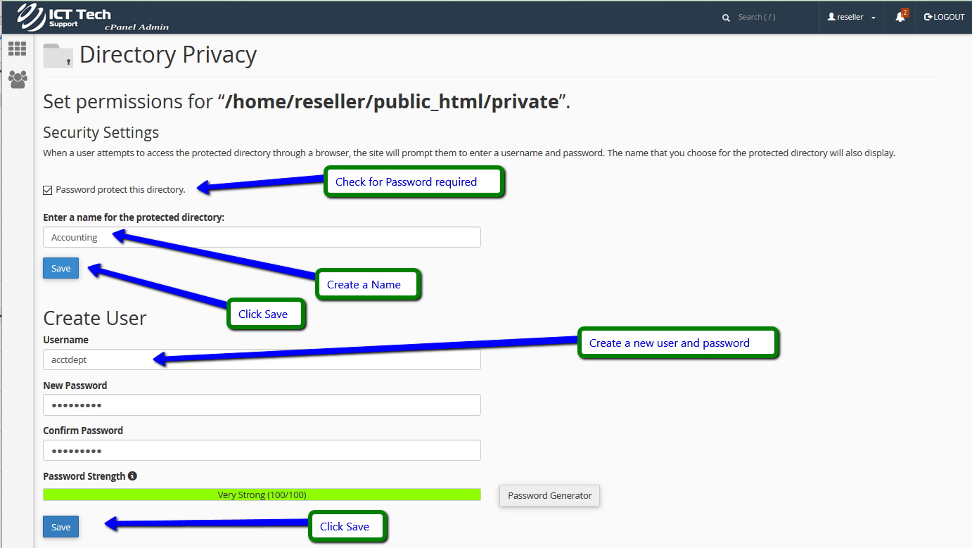 Check the "Password Protect" box, then give a name for the directory, and click "Save". Create a new user with password then click "Save"