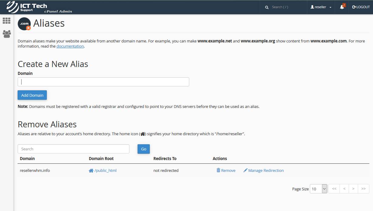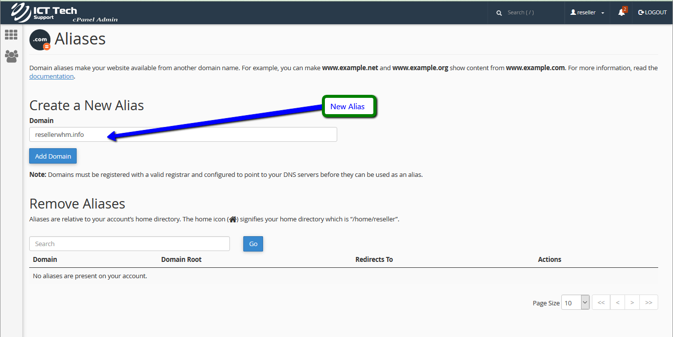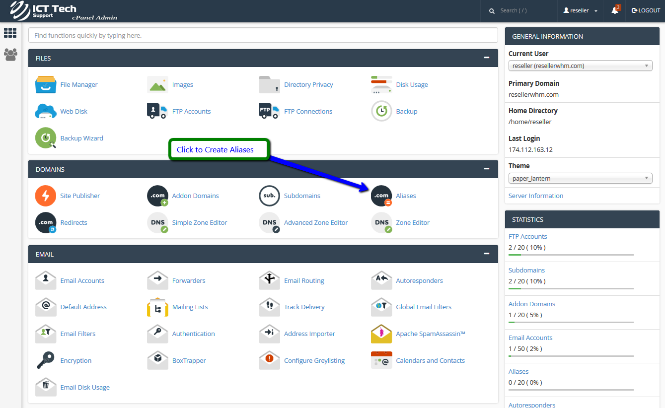 This demo assumes you've already logged in to cPanel, and are starting on the home screen. Click the "Aliases" icon.A domain alias is useful when you have additional domain names that you want people to be able to use to get to your website.Enter the new domain, then click "Add Domain".