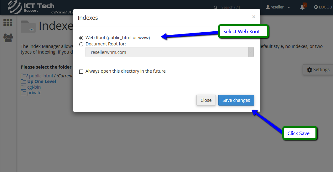 The Index Manager enables you to control how directories on your website are displayed. For Root Web click settings then select "Web Root" then click "Save changes"