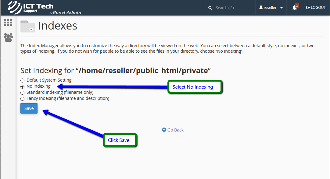 There are four settings to choose from. The "Default System Setting" allows the directory contents to be shown. "No Indexing" does not allow directory contents to be shown. "Standard Indexing" prevents browsers from viewing contents of directories that do not contain image files. "Fancy Indexing" prevents browsers from viewing contents of directories that do contain image files. Since we do not want the contents of this directory shown, we'll choose the "No Indexing" option.